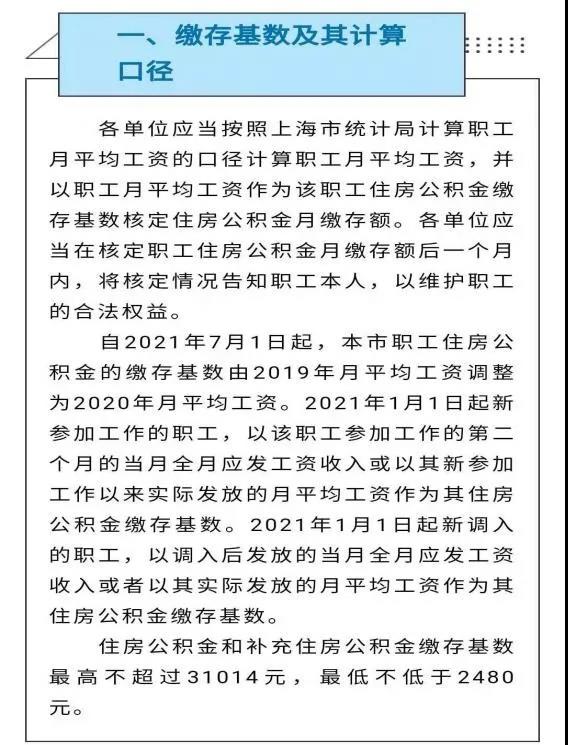 步入2021年7月,多省市地区接连发文调整2021年度住房公积金基数,我们以上海市为例:住房公积金和补充住房公积金缴存基数最高不超过31014元,最低不低于2480元。