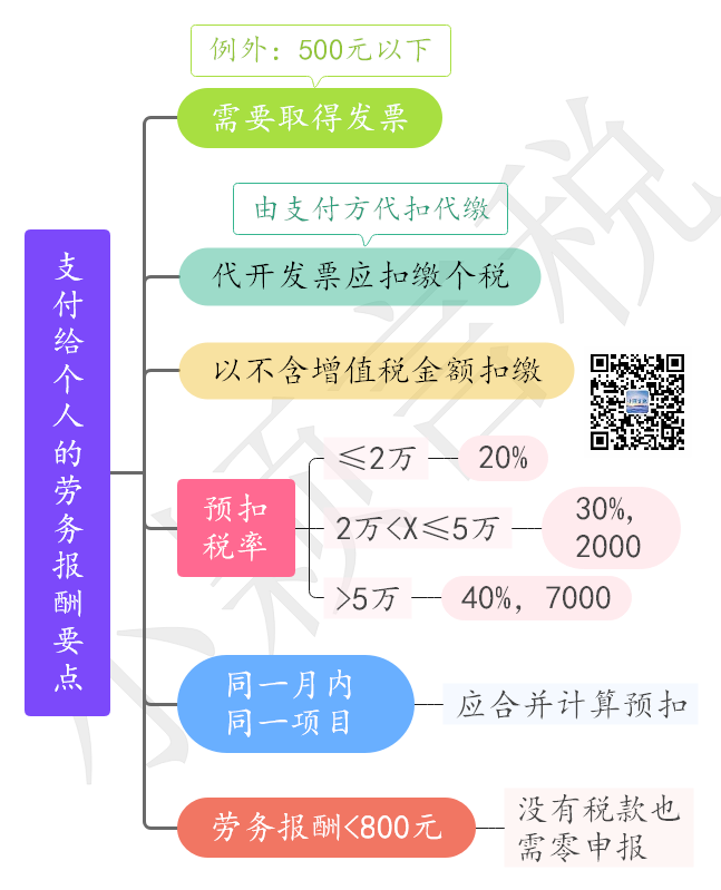日常经营活动中,免不了会出现给个人支付劳务报酬的业务,对这个事情很多人都存在以下六个涉税误区,逐项对照一下,看你中了几条?误区一 :支付给个人的费用,不需要取得发票。个人提供劳务取得报酬,属于增值税的应税范围,支付报酬的企业应该凭发票税前扣除。很多以为个人不能开发票,这是错误的,个人可以去税务局代开发票。根据《中华人民共和国发票管理办法》第十六条规定,需要临时使用发票的单位和个人,可以凭购销商品、提供或者接受服务以及从事其他经营活动的书面证明、经办人身份证明,直接向经营地税务机关申请代开发票。依照税收法律、行政法规规定应当缴纳税款的,税务机关应当先征收税款,再开具发票。税务机关根据发票管理的需要,可以按照国务院税务主管部门的规定委托其他单位代开发票。例外情况:支付给个人500元以下的劳务报酬可以不用发票。政策规定:28号文规定,对方为依法无需办理税务登记的单位或者从事小额零星经营业务的个人,其支出以税务机关代开的发票或者收款凭证及内部凭证作为税前扣除凭证,收款凭证应载明收款单位名称、个人姓名及身份证号、支出项目、收款金额等相关信息。小额零星经营业务的判断标准是个人从事应税项目经营业务的销售额不超过增值税相关政策规定的起征点。财税2016年36号文规定,个人发生应税行为的销售额未达到增值税起征点的,免征增值税;达到起征点的,全额计算缴纳增值税,按期纳税的,为月销售额5000-20000元(含本数);按次纳税的,为每次(日)销售额300-500元(含本数)。误区二:支付给个人的劳务报酬,税务局在代开发票的时候就已经扣个税了。这也是一个常见的理解错误,个人到税务局去代开劳务报酬的发票时,税务机关是不会在代开发票环节征收个人所得税的,而且在开出发票的备注栏也会写着个人所得税由支付方代扣代缴,意味着代开发票的时候只交了增值税和其他税费,个人所得税是由费用的支付方来代扣代缴的。支付方作为扣缴义务人如果不为个人代扣代缴个人所得税的话,是会受到行政处罚的。根据《中华人民共和国税收征收管理法》第六十九条规定,扣缴义务人应扣未扣、应收而不收税款的,由税务机关向纳税人追缴税款,对扣缴义务人处应扣未扣、应收未收税款百分之五十以上三倍以下的罚款。误区三:支付给个人的劳务报酬,以含税金额来扣缴个人所得税。这是很多新手会计的常犯错误,个人所得税应该以不含增值税的金额来计算。举个例子:张三给甲公司维修电脑,收了10300元,那么不含税收入10300/1.03=10000元,甲公司应为张三预扣预缴个税10000*(1-20%)*20%=1600元注:疫情期间1%。误区四:企业在支付给个人劳务报酬的时候,预扣对方个人所得税税额时,直接按照预扣税率20%来计算。这是对劳务报酬预扣预缴税率不熟悉,劳务报酬预扣预缴税率分为三档,看下面这个表,最高税率可达40%。个人所得税预扣税率表(居民个人劳务报酬所得预扣预缴适用)