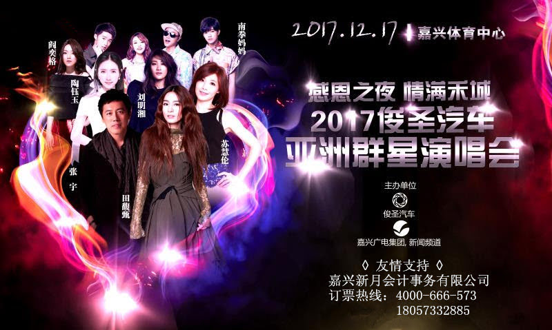 本次演唱会由俊圣汽车和嘉兴广电集团联合主办,并斥巨资邀请到当下人气女神级歌手田馥甄、台湾歌手张宇、80后歌手苏慧伦、台湾著名团体南拳妈妈、中国好声音学员刘明湘、新生代歌手阎奕格等强大阵容,这将是乌镇互联网大会之后嘉兴的又一盛事。优惠购票咨询请拨打4000-666-573/18057332885。