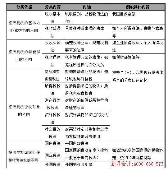 我国各个税种的分类及内容 我国现行税法体系 (一)税法体系概述 税法体系就是通常所说的税收制度。是指在既定的管理体制下设置的税种以及与这些税种的 征收、管理有关的,具有法律效力的各级成文法律、行政法规、部门规章等的总和。包括三个层次: 一是不同的要素构成税种;二是不同的税种构成税制;三是规范税款征收程序的法律法规。 这些内容的法律形式也就是税法。税法还可以分为税法通则、各税税法(条例)、实施细则、具体规定四个层次。其中,“税法通则”规定一个国家的税种设置和每个税种的立法精神,各个税种的“税法(条例)”分别规定每种税的征税办法,“实施细则”是对各税税法(条例)的详细说明和解释,“具体规定”则是根据不同地区、不同时期的具体情况制定的补充性法规。目前,世界上只有少数国家单独制定税法通则,大多数国家都把税法通则的有关内容包含在各税税法(条例)之中。 (二)税法分类 税法分类在理论和实务领域都有比较重要的意义。税法的一般分类如下: