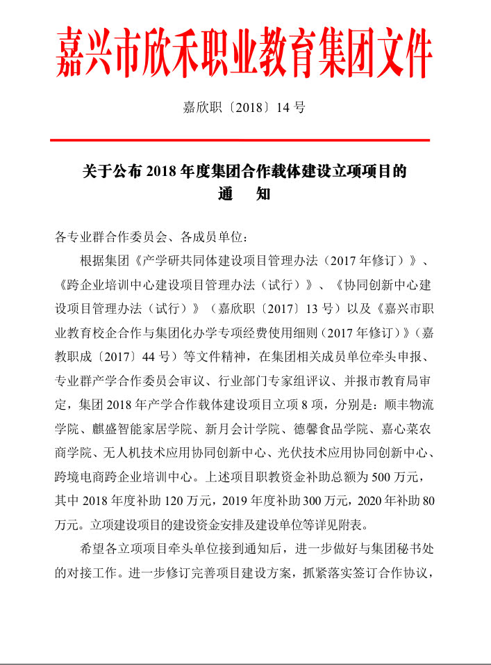 最终,于2018年6月11日,由浙江省教育厅,嘉兴市人民政府、嘉兴市教育局、嘉兴市财政局牵头开展2018年度集团合作载体建设立项项目中,我司与嘉兴秀水中等专业学校共同建立的产学研共同体——新月会计学院与顺丰物流学院等8个产学研共同体,成功立项。